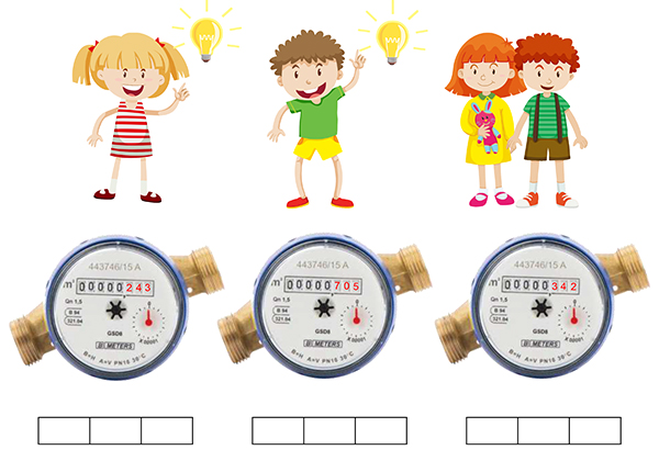 Поясніть учням, що кількість витраченої води у твоїй квартирі вимірює спеціальний прилад – лічильник для води. Покажіть їм зображення на слайді 9 і запропонуйте: допомогти дітям визначити показники лічильників, порівняти їх і визначити, чий лічильник показує найбільший показник використання води?